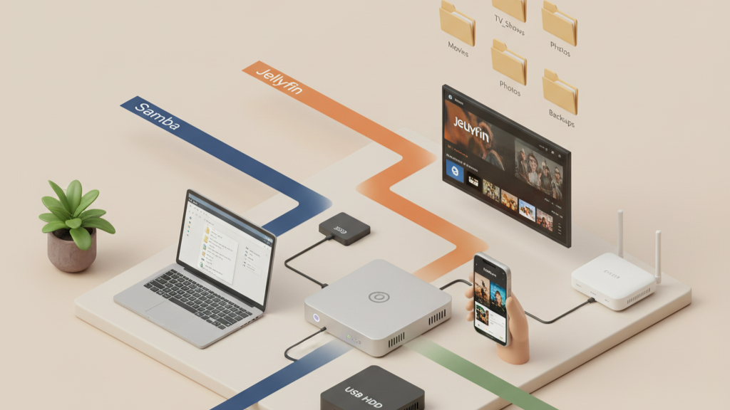 2. **自动化媒体中心**:让 **Jellyfin** 自动发现并索引您存入共享硬盘的电影和电视剧,打造您的私人影院。