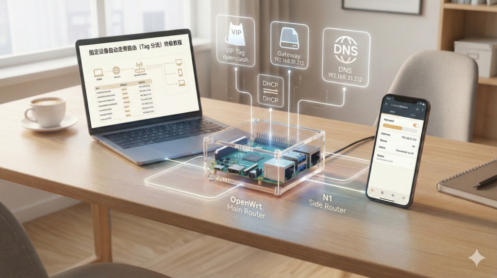 适用场景: 主路由 (ImmortalWrt/OpenWrt) 负责拨号和 DHCP,旁路由 (N1/OpenClash) 负责魔法上网。 目标: 指定的手机/电脑连接 WiFi 后,自动获取旁路由的网关和 DNS,无需手动在设备上修改 IP;其他设备不受影响,继续走主路由。